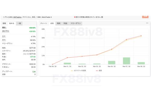 最新自動売買。 リアル口座で$200から始めています。 XMのマイクロ口座です。 今日は昨日の同時刻よりややスローです。 現時点で38%。 大きく?育つか??